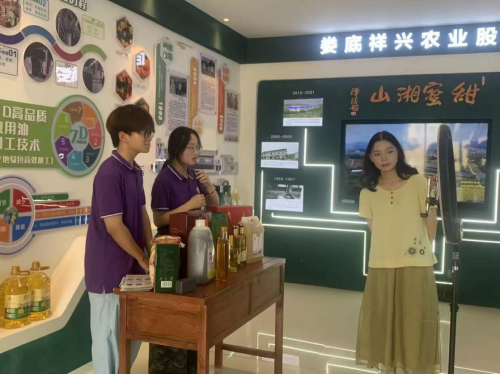 7月5日,湘潭大學公共管理學院三下鄉社會實踐團的成員化身“主播”于湖南祥興農林科技有限公司講解湘山茶油的制作流程、獨特工藝和嚴格品控,積極與觀眾互動。