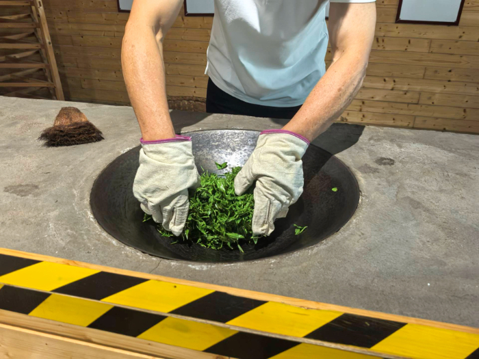 隊員們來到非遺工坊,親身體驗金井茶制作技藝。在非遺傳承人的手把手指導下,嘗試炒青、揉捻等關鍵工序。灼熱的鐵鍋、翻騰的茶葉、需要精準掌控的力道與節奏,讓隊員們深刻領悟到“匠心”二字的分量。在嘗試捻茶的過程中,每一位隊員都有親身體會——看似簡單的步驟,中間需要多少年的沉淀,才能做到如此爐火純青。每一次翻炒,都是與歷史的對話;每一次揉捻,都是對技藝的致敬。在與當地專業制茶人的交談中,隊員們了解到了藏在每一顆深綠茶葉后更深的秘密。三四月早春的嫩芽為制茶最上乘原料,而這樣的嫩芽卻不能用機器大規模采摘,只能經過茶農的手親自摘下,這是一項耗時耗力的精細工作。采茶不易,制茶更是困難,繁復的工藝、匠人的技巧、對火候的精準把握,才能真正制作出風味不同的茶葉。從枝頭翠綠的嫩芽,到茶碗間逸出的淡淡清香,制茶工藝的傳承是如此重要。這堂生動的“非遺實踐課”,極大地增強了隊員們對傳統文化價值的認同感與傳承創新的使命感。