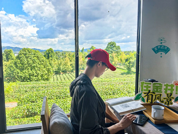 當日下午,實踐隊來到金井茶業自然展館品茶讀書,開啟了一場沉浸式茶文化體驗。落地窗外綠浪連連,窗內,隊員們輕聲誦讀《茶經》經典段落,在氤氳茶香與書香交織的氛圍中,仿佛與古圣先賢進行了一場跨越時空的對話。在這里,茶不再只是飲品,它承載著歷史、哲學和生活美學。品一口金井茶,讀一段《茶經》,仿佛觸摸到了中華文明跳動的脈搏,那份對民族文化的認同感和傳承使命感油然而生。