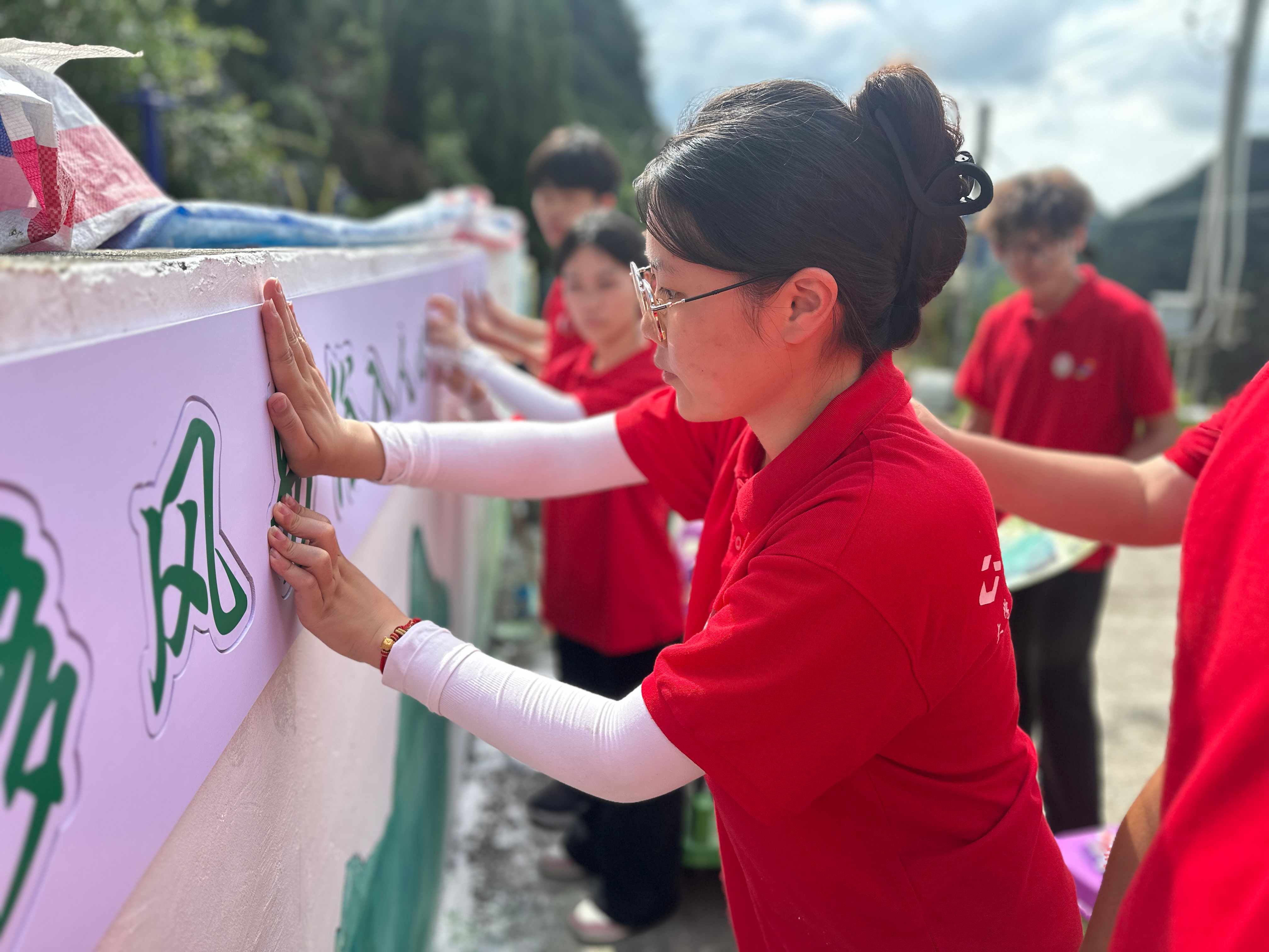 無論炎炎夏日還是風(fēng)吹雨打,當(dāng)最后一縷余暉撒過墻面,為期7天的時間里,墻繪創(chuàng)作從“大美群樂”的田園詩意,到“建設(shè)美麗鄉(xiāng)村,共享幸福生活”的民生愿景;從“鑄牢中華民族共同體意識”的同心畫卷,到“移風(fēng)易俗入人心,綠色發(fā)展共踐行”的新風(fēng)尚,完成了長32.54米、高2.29米、總面積60平方米的5幅特色墻繪。