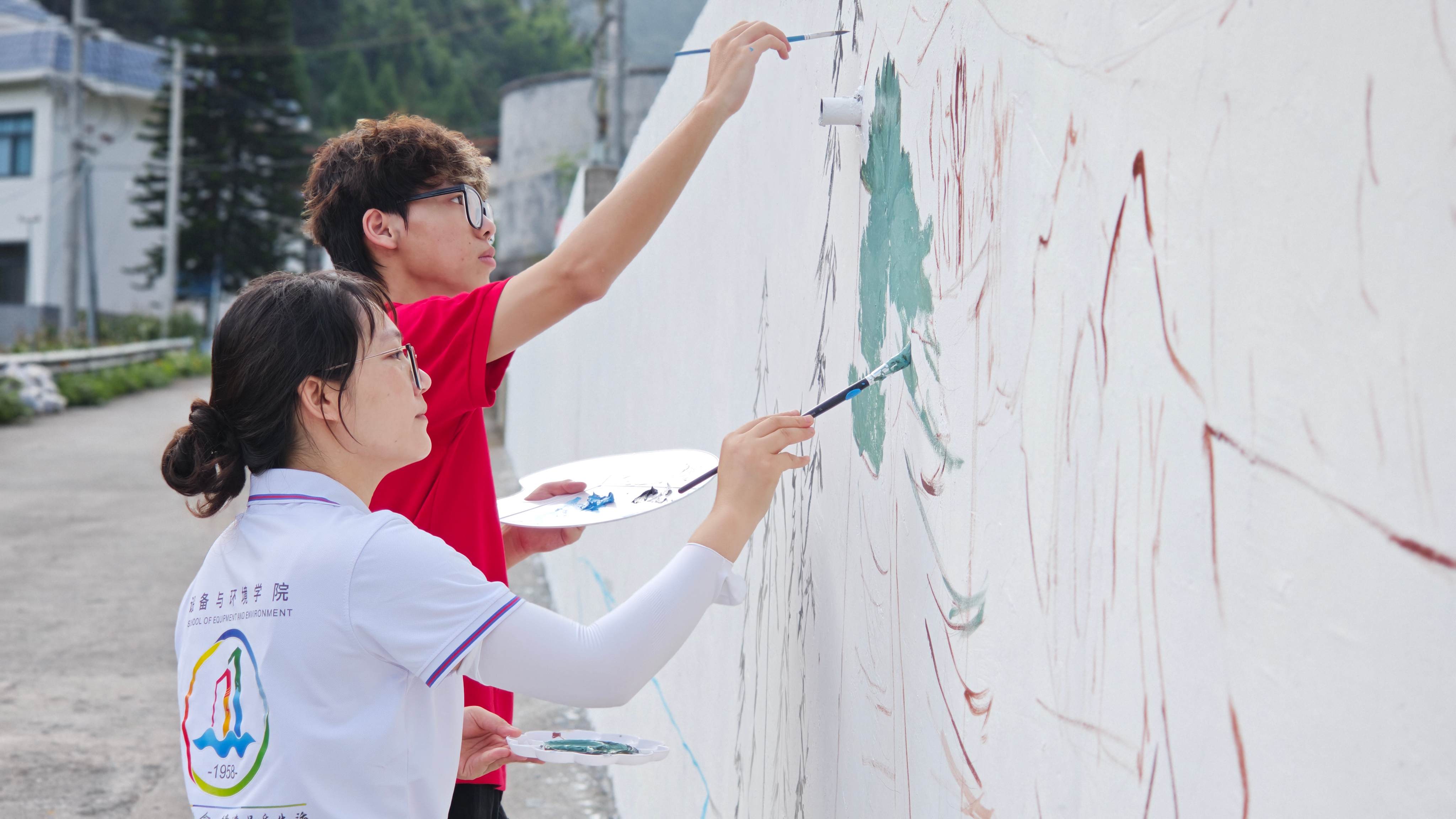 圖為實踐團成員在給墻繪上色(通訊員 李兆健)