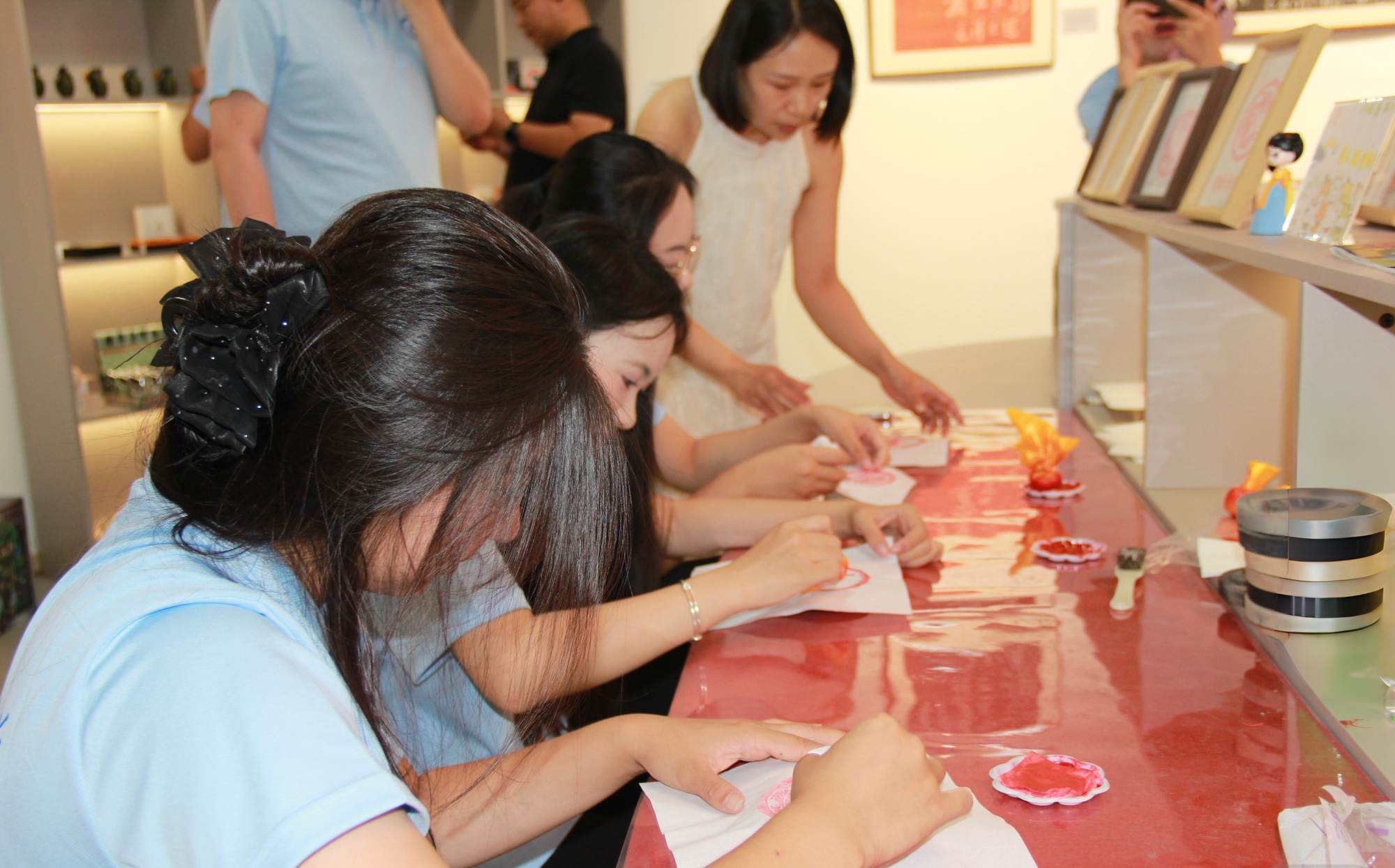 圖為靖宇英魂文創(chuàng)空間工作人員指導(dǎo)實(shí)踐團(tuán)成員進(jìn)行非遺拓印文創(chuàng)制作。楊濤 供圖