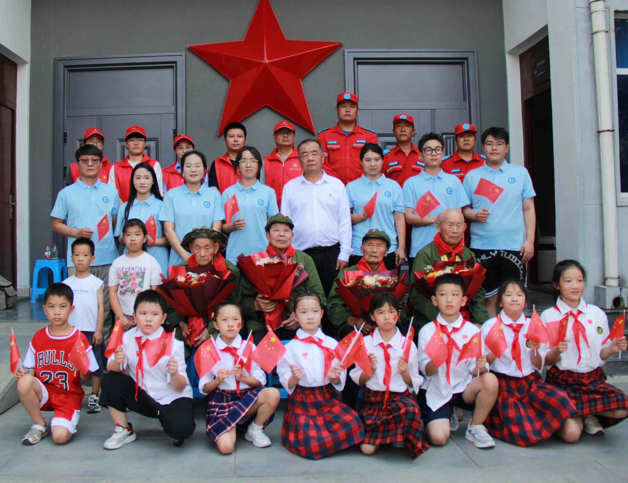 圖為實(shí)踐團(tuán)與袁國(guó)章、李明臣、藏海龍、張富起四位老兵,蛟龍救援隊(duì)隊(duì)員和少先隊(duì)員合影,彰顯老中青少四代人的紅色傳承。楊濤 供圖