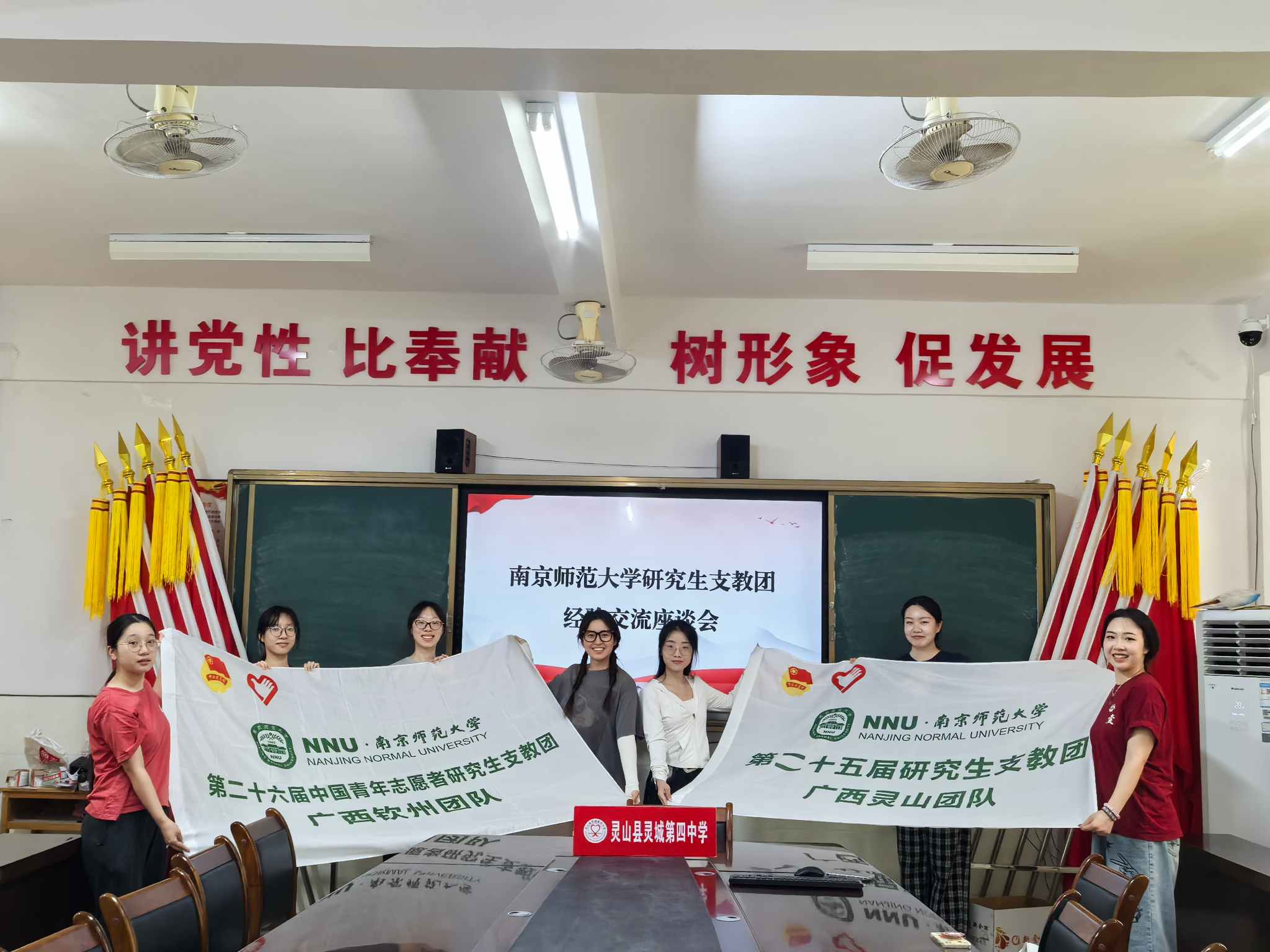 圖為團隊成員與支教志愿者在靈山縣靈城第四中學開展經驗交流座談會。吳星睿 供圖 “支教團成員通過重返課堂、師生座談、勵志講座等形式,為學生帶來溫暖與力量。這充分證明,愛與責任可以跨越時間和距離,志愿精神將薪火相傳、生生不息。”靈山縣靈城第四中學校長李偉光評價道。