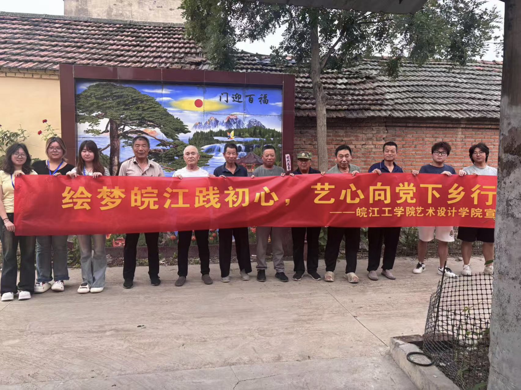 3.活動尾聲,團(tuán)隊(duì)與鄉(xiāng)村黨員群眾攜手,以“繪夢皖江踐初心,藝心向黨下鄉(xiāng)行”橫幅定格難忘瞬間。黨群同心,讓藝術(shù)美化不止是視覺改造,更成為傳承鄉(xiāng)土文化、凝聚振興合力的契機(jī)。此次三下鄉(xiāng)活動,“繪夢皖江”團(tuán)隊(duì)用井蓋藝術(shù)、墻繪創(chuàng)作等方式激活鄉(xiāng)村美學(xué)基因,讓藝術(shù)扎根鄉(xiāng)土、服務(wù)群眾。