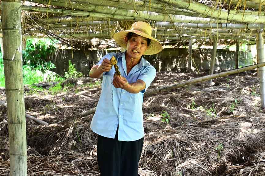 沿著蜿蜒的田間小道,團(tuán)隊(duì)走進(jìn)連片的天麻種植基地。遮陽網(wǎng)下,腐殖土覆蓋的菌床整齊排列,濕潤(rùn)的空氣里彌漫著草本植物的清香。當(dāng)?shù)卮迕翊笫瀣F(xiàn)場(chǎng)演示天麻采挖過程:“天麻靠蜜環(huán)菌提供養(yǎng)分,挖的時(shí)候要順著菌索找,不能傷了菌絲。”隨著覆土輕輕撥開,一顆紡錘形的新鮮天麻露出褐色表皮,肉質(zhì)飽滿的塊莖上還附著濕潤(rùn)的泥土。