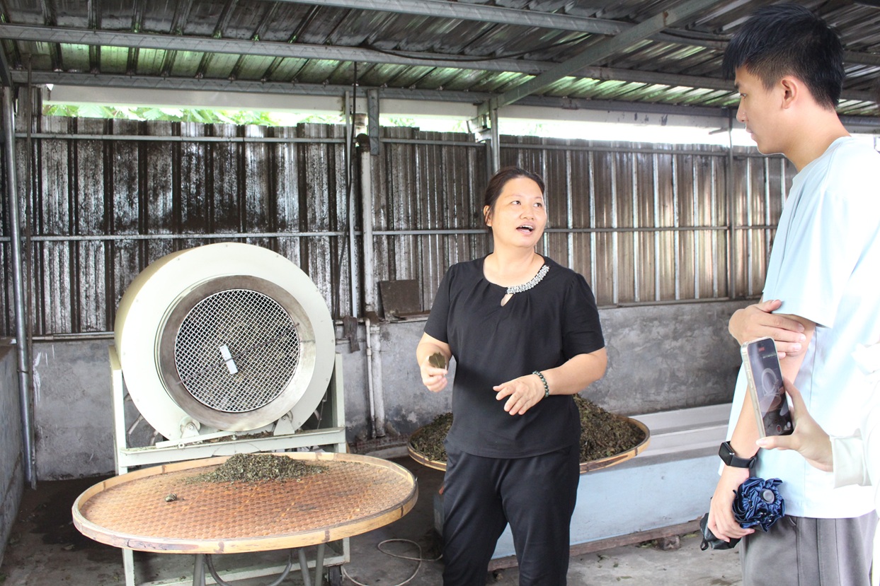 隨后,實(shí)踐團(tuán)來(lái)到了公司青錢(qián)柳的茶葉種植地進(jìn)行實(shí)地調(diào)研,親眼觀察到茶樹(shù)的生長(zhǎng)環(huán)境、切身體驗(yàn)了茶葉的采摘過(guò)程。接著,隊(duì)員們?cè)诒P(pán)少杰的帶領(lǐng)下來(lái)到紫米酒、青錢(qián)柳的加工車(chē)間,進(jìn)一步了解產(chǎn)品的生產(chǎn)過(guò)程及其特點(diǎn)。紫米酒醇厚之酒香,未入儲(chǔ)藏室便可聞及,且其中蘊(yùn)含著紫米的甜香。青錢(qián)柳的制造過(guò)程包括殺青、揉捻、干燥等工藝,這樣制作出來(lái)的茶葉清香十足,捻一點(diǎn)放入口中生嚼,比起茶葉都有的苦味,更明顯的是甘甜與茶香。參觀完畢后,盤(pán)少杰向?qū)嵺`團(tuán)提出希望隊(duì)員們拍攝耕田翁公司產(chǎn)品的宣傳營(yíng)銷(xiāo)廣告,幫助推廣紫米、紫米餅、絲苗米、青錢(qián)柳等產(chǎn)品。
