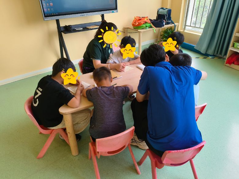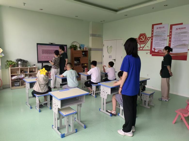 隨后,志愿者們迅速代入助教身份,進(jìn)入各自班級(jí)展開陪伴工作。他們積極熱情地與孩子們進(jìn)行互動(dòng),陪伴孩子寫下工整的漢字;與孩子們默契地傳遞籃球;游戲環(huán)節(jié)陪伴并保護(hù)孩子們;甚至有的可以站到臺(tái)前帶領(lǐng)孩子們開啟課堂;志愿者與孩子們親密互動(dòng),歡聲笑語回蕩在整個(gè)中心,與孩子們度過知識(shí)課堂,也更加了解到了特殊孩子們的教育模式。