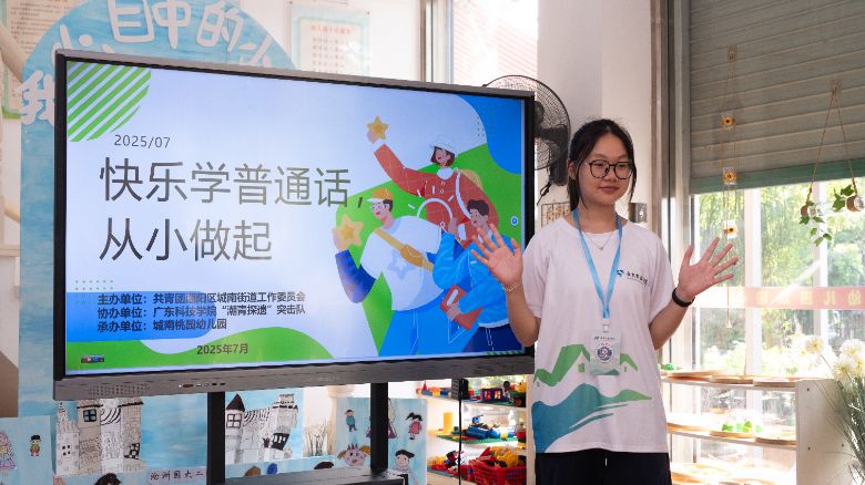 教室里,普通話推廣課堂暖意融融,孩子們清脆的普通話從教室里傳出,一字一句都透著認(rèn)真。潮青探遺突擊隊(duì)的隊(duì)員們化身“語(yǔ)言小老師”,用標(biāo)準(zhǔn)流利的普通話講起繪本里的奇妙故事,帶著孩子們念起朗朗上口的兒歌。從咬準(zhǔn)每一個(gè)音節(jié)到清晰表達(dá)一句話,孩子們眼中閃爍著求知的光,讓溝通的種子在稚嫩心田悄悄發(fā)芽。