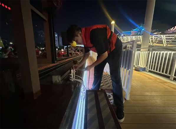 實踐團成員在船上恪盡職守,提前將救生衣整齊放置在游客觸手可及之處。登船時,并主動引導游客正確穿戴。航行期間,實踐團成員來回巡視,確保安全無虞。細致服務讓游客盡情沉醉于瑯琊夜景。