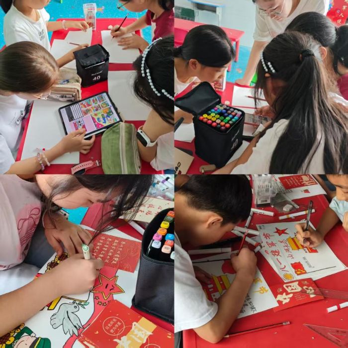 手抄報里述八一,筆墨之間敬軍魂。 結合“八一建軍節”的時間節點,實踐團以“手抄報創作”為核心載體,開展推普與紅色教育融合的實踐活動。活動現場,團隊成員徐鐲瑜為孩子們講述八一建軍節的歷史淵源——從南昌起義的槍聲到新時代軍人的使命擔當,用生動的故事、清晰的表達,讓紅色記憶在孩子們心中扎根。隨后,成員們發放畫筆、彩紙等創作材料,手把手指導孩子們以“述憶八一・語敬軍魂”為主題設計手抄報。孩子們筆下的手抄報色彩鮮艷、內容豐富,每一筆線條都飽含對軍人的崇敬,每一段文字都凝聚著對國家的熱愛,普通話成為串聯創意與情感的紐帶,讓紅色情懷通過語言與藝術的融合得以傳遞。