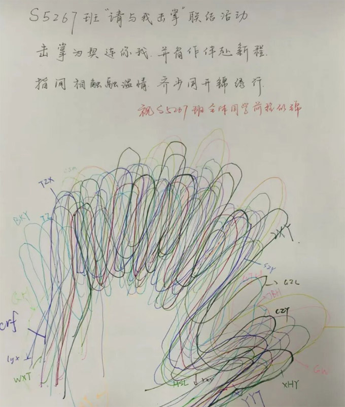 隨著活動(dòng)推進(jìn),教室里的創(chuàng)作熱情愈發(fā)濃厚。有的同學(xué)專(zhuān)注勾勒掌紋,有的認(rèn)真挑選彩筆,各有各的投入模樣。在這個(gè)過(guò)程中,同學(xué)們不僅釋放了科研與生活中的壓力,更通過(guò)這張承載著所有同學(xué)手輪廓的紙,感受到了與全班同學(xué)緊密相連的溫暖,心靈在互動(dòng)與創(chuàng)作中得以舒展愉悅。