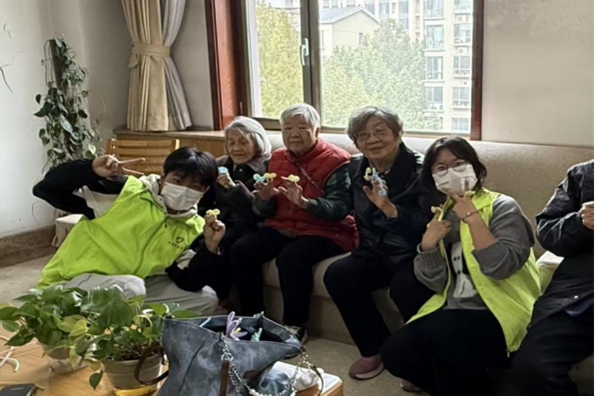 (志愿者與老人們展示扭扭棒手工成品 攝影|劉柳)