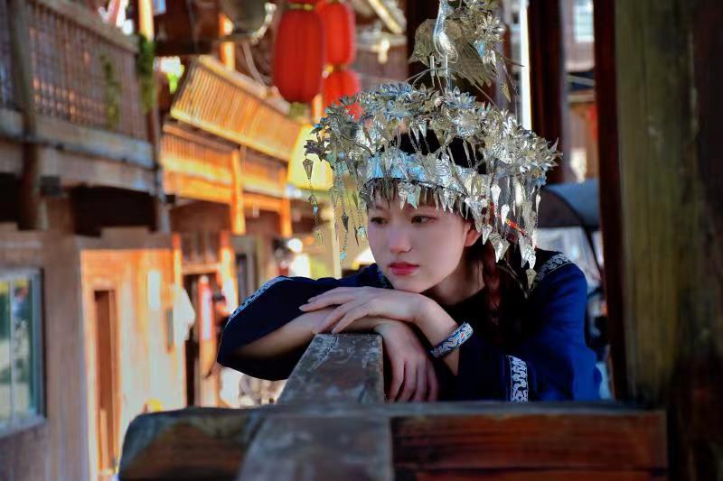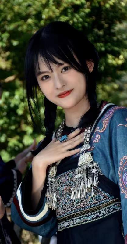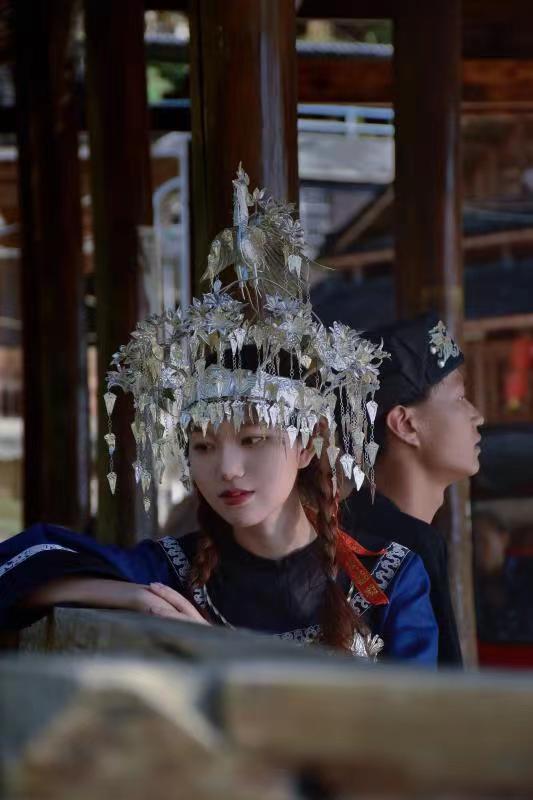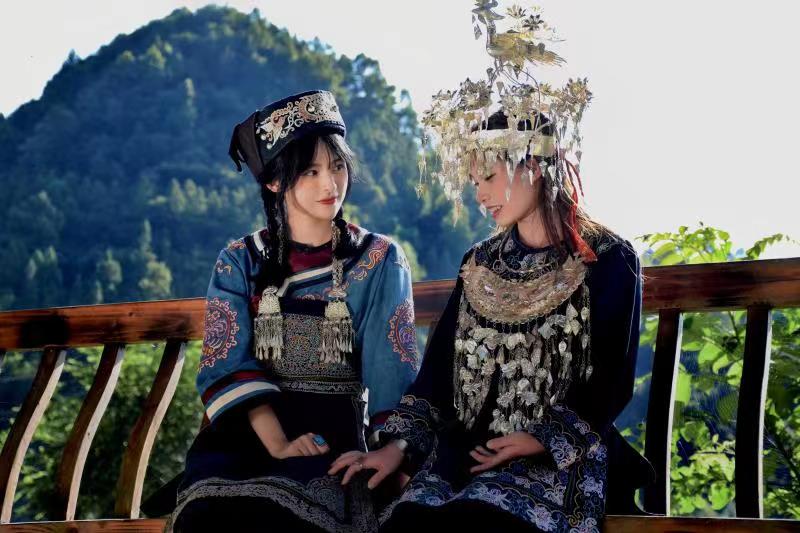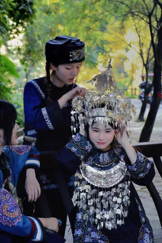 通過兩天的實(shí)地調(diào)研我們發(fā)現(xiàn)許多問題,首先,馬尾繡文化宣傳方面存在顯著問題。作為水族特色刺繡技藝,卻僅在當(dāng)?shù)亓鱾鳎叱鋈紖s鮮為人知,我們不僅感到惋惜,如此精美的刺繡不應(yīng)埋沒于此。帶著“民族”與“非遺”標(biāo)簽的馬尾繡文化應(yīng)走入更多人的視野。其次,我們更能發(fā)現(xiàn),馬尾繡文化傳承方面也存在一定的問題。當(dāng)?shù)啬贻p人對(duì)學(xué)習(xí)馬尾繡技藝興致不佳,政府引導(dǎo)的技藝學(xué)習(xí)活動(dòng)參與感較低。那么如何讓年輕人更喜歡這項(xiàng)技藝并愿意學(xué)習(xí)呢?我們結(jié)合當(dāng)下時(shí)代特色,迎合年輕人的愛好傾向,拍攝了一組馬尾繡服飾寫真。所用拍攝道具大多為國(guó)家級(jí)馬尾繡傳承人宋水仙女士支持物品,如:水族民間藏館內(nèi)的馬尾繡服飾、戒指、頭巾、手鐲、包包等。