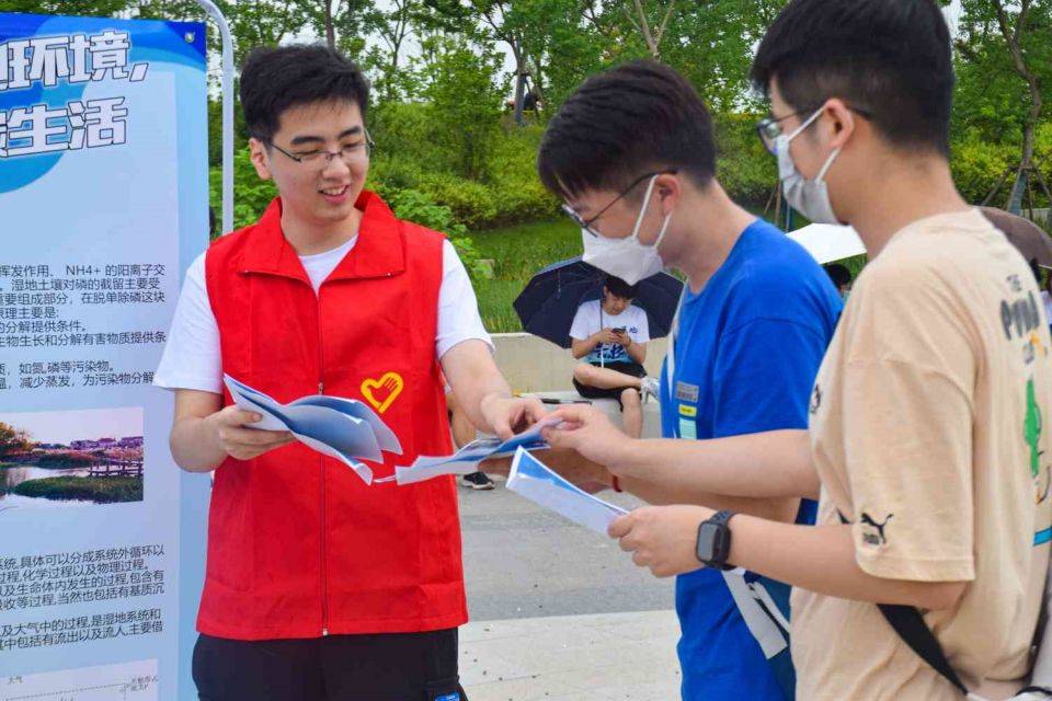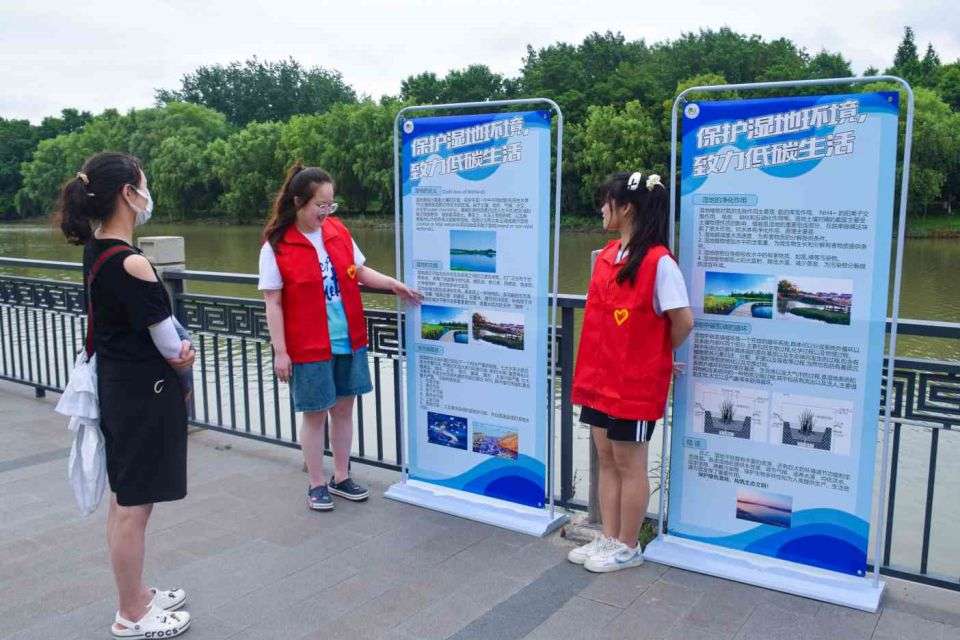 小隊成員在南京七橋甕生態濕地公園隨機對路人進行科普宣講,從濕地定義入手,將濕地巨大的環境調節能力和生態效益以及其降解污染物的能力介紹給群眾,展示了濕地在保護生物多樣性和為人類提供生產生活資料方面發揮的重要作用。