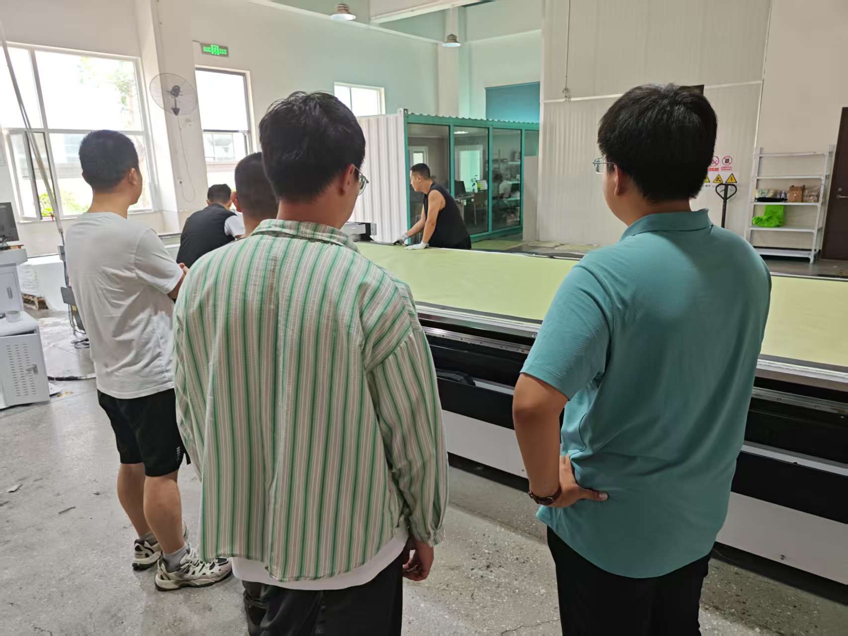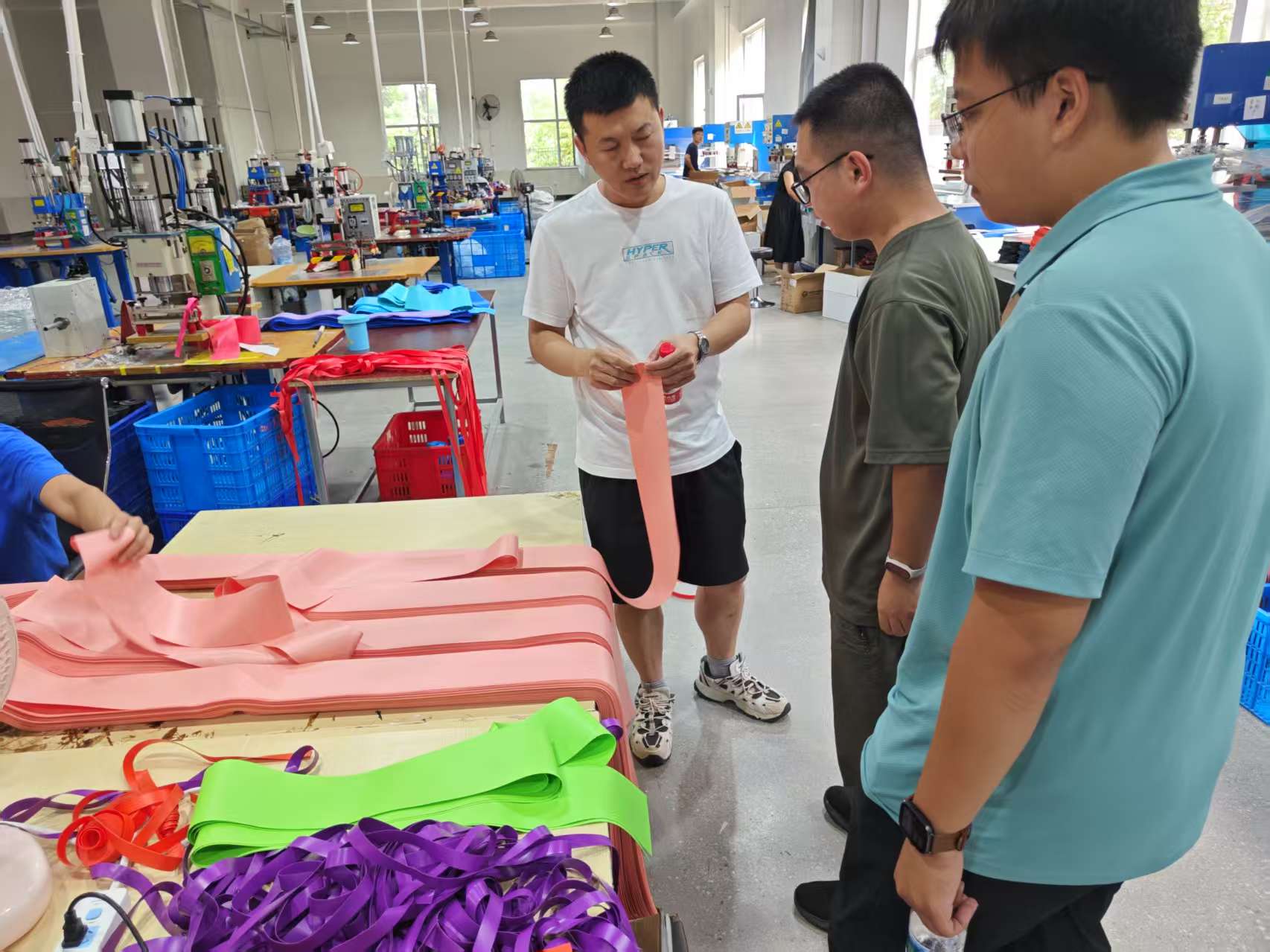 在公司工作人員的引領下,隊員們實地走訪企業生產車間,依次參觀切割、熱熔、刷膠、拼貼等工段,觀察高強度TPU面料的激光裁切過程,記錄智能控溫系統在膠層熔融環節的參數設置,并了解機械臂與人工協作完成最終組裝的工作模式。公司技術人員現場解答了隊員們關于工藝精度控制、生產效率優化等疑問,隊員們結合課堂所學提出改進建議,得到企業認可。
