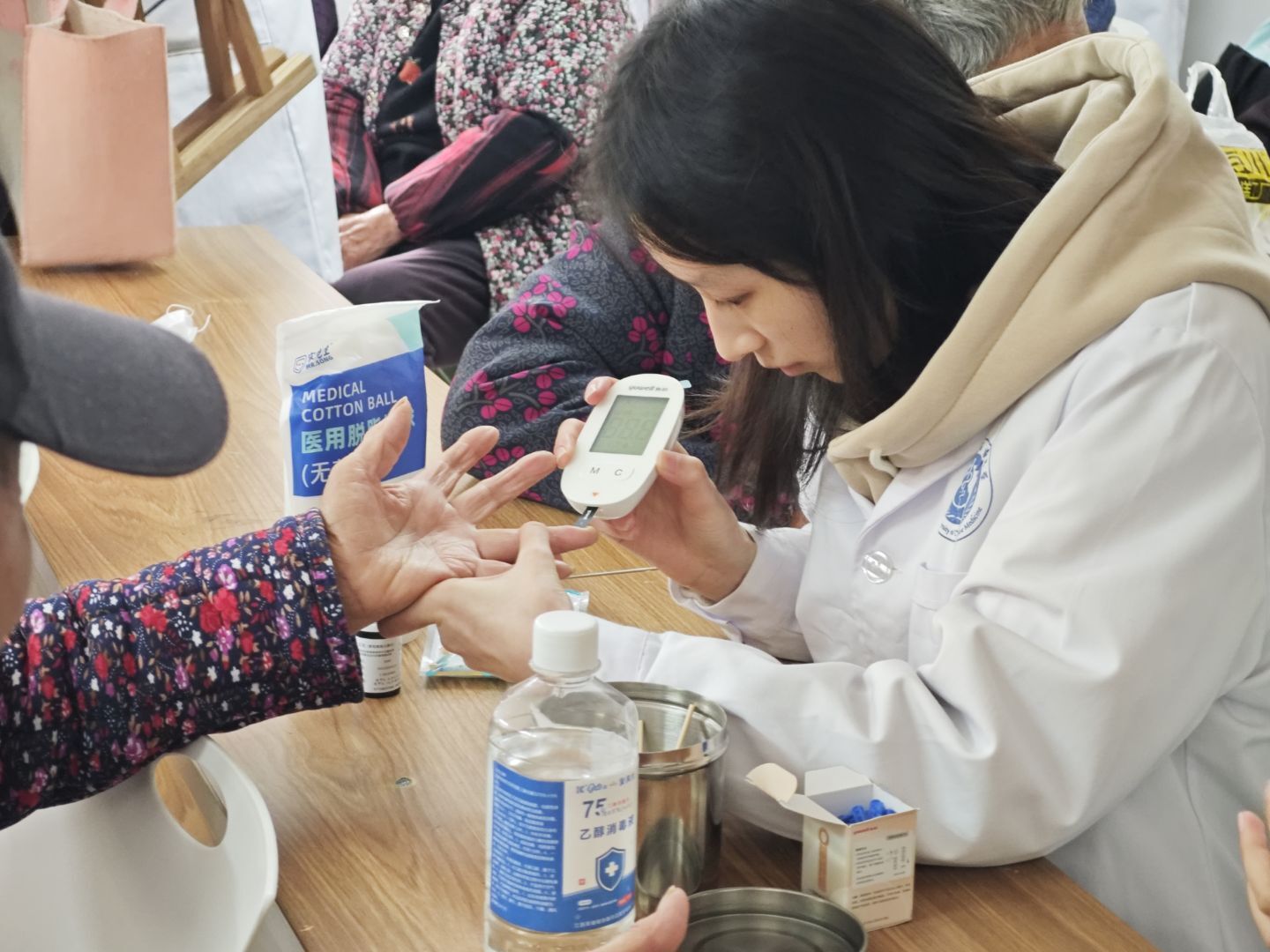 活動現(xiàn)場,推拿區(qū)志愿者們提前準(zhǔn)備好推拿用的推拿布,防止在按摩時讓老人感到不適。按摩區(qū)志愿者以小魚際,大魚際,一指禪等手法去按摩老年人肩頸部位風(fēng)池穴、肩井穴去緩解肩頸僵硬,還通俗講解穴位作用。測量區(qū)志愿者一邊細(xì)心地為老人測血壓、測血糖,一邊耐心記錄數(shù)據(jù)并給出健康建議。其次,我們還開展了預(yù)防三高的宣講活動,我們從中醫(yī)“治未病”理念入手,用通俗的語言講解高血壓、高血糖、高血脂的中醫(yī)成因,還結(jié)合季節(jié)特點,分享了飲食調(diào)理(如芹菜、山楂等食材的養(yǎng)生用法)、穴位按摩、八段錦簡易動作等預(yù)防“三高”的實用妙招
