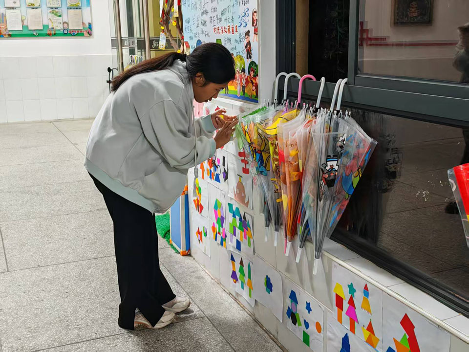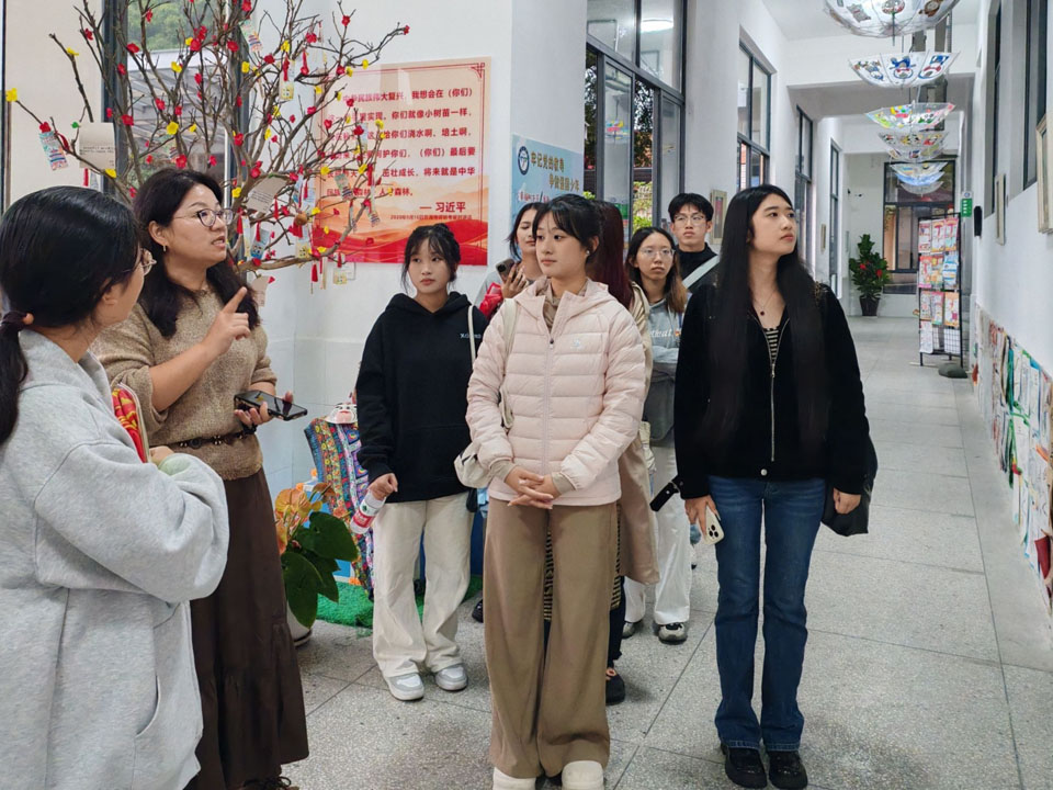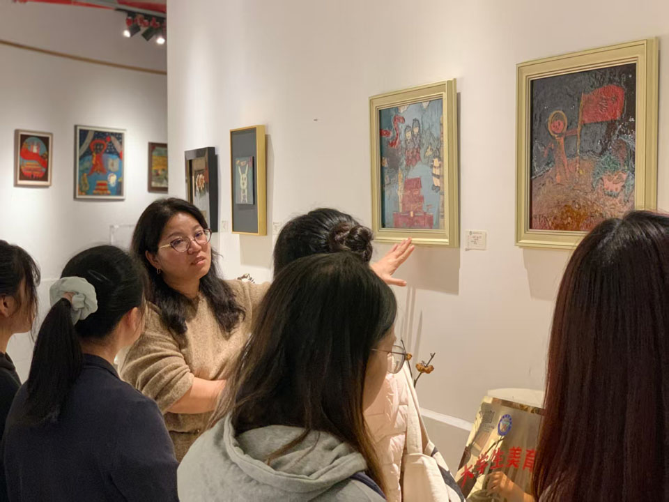 活動(dòng)伊始,團(tuán)支部書記羅思淇從生活常見事物出發(fā),生動(dòng)講解對(duì)稱軸與軸對(duì)稱圖形的概念,學(xué)生們積極互動(dòng),初步感知軸對(duì)稱圖形的平衡與和諧。隨后,由2023級(jí)國畫班團(tuán)支部成員李子凡主持,將學(xué)生分為繪畫、拼貼與剪紙三組,簡(jiǎn)要介紹創(chuàng)作方式并展示范例。在創(chuàng)作環(huán)節(jié),學(xué)生們熱情投入創(chuàng)作,現(xiàn)場(chǎng)氣氛活躍。課堂結(jié)束后,福州市麥浦小學(xué)校長(zhǎng)陳潘春邀請(qǐng)支部成員參觀“漆趣齋”工作室,著重介紹了學(xué)生漆畫作品及學(xué)校美育工作,并對(duì)本次活動(dòng)提出建議,呼吁師范生重視美育教學(xué)工作。
